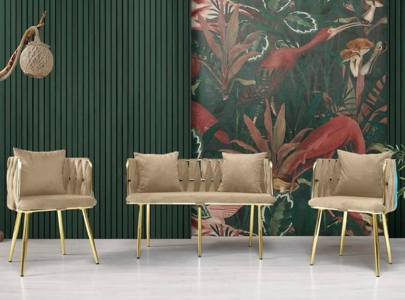 Sur cette image, on voit un mini salon élégant avec un ensemble de mobilier beige et doré. Il se compose de deux fauteuils assortis et d’un canapé deux places. Voici quelques éléments qui le caractérisent :