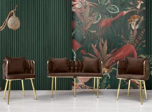 Décoration murale tropicale : Le fond vert sombre avec un motif floral exotique crée un contraste intéressant avec le mobilier clair et ajoute une touche de nature sophistiquée à l’espace.