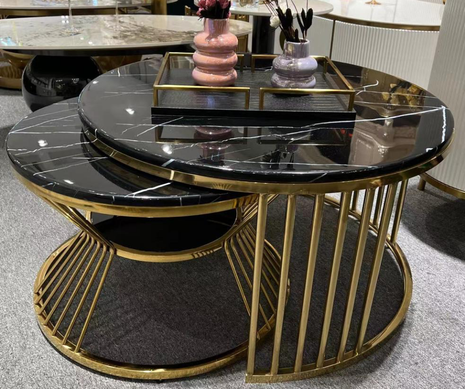 Ensemble : L’ensemble se compose de deux tables basses qui peuvent être de tailles différentes, souvent placées côte à côte pour créer un effet visuel harmonieux. L’une des tables peut être plus grande et servir de pièce principale, tandis que l’autre est plus petite et peut être utilisée comme table d’appoint ou être placée en surélévation pour un effet décoratif.Matériau : Les plateaux en marbre sont non seulement esthétiques mais aussi durables. Le marbre peut venir dans une gamme de couleurs comme le blanc avec des veines grises, le noir profond, le gris clair, ou des nuances plus exotiques comme le vert ou le rose.